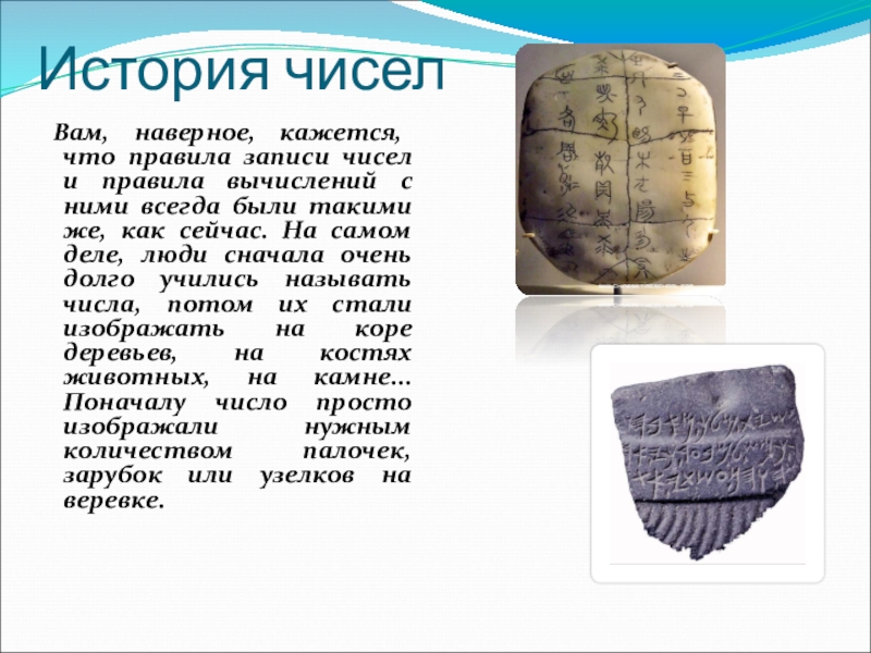 вычислений с ними всегда были такими же, как сейчас. На самом деле, люди сначала очень долго учились называть числа, потом их стали изображать на коре деревьев, на костях животных, на камне... Поначалу число просто изображали нужным количеством палочек, зарубок или узелков на веревке.
