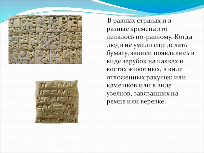 по-разному. Когда люди не умели еще делать бумагу, записи появлялись в виде зарубок на палках и костях животных, в виде отложенных ракушек или камешков или в виде узелков, завязанных на ремне или веревке.