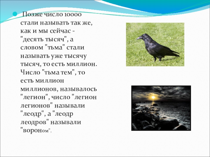 сейчас - "десять тысяч", а словом "тьма" стали называть уже тысячу тысяч, то есть миллион. Число "тьма тем", то есть миллион миллионов, называлось "легион", число "легион легионов" называли "леодр", а "леодр леодров" называли "вороном".