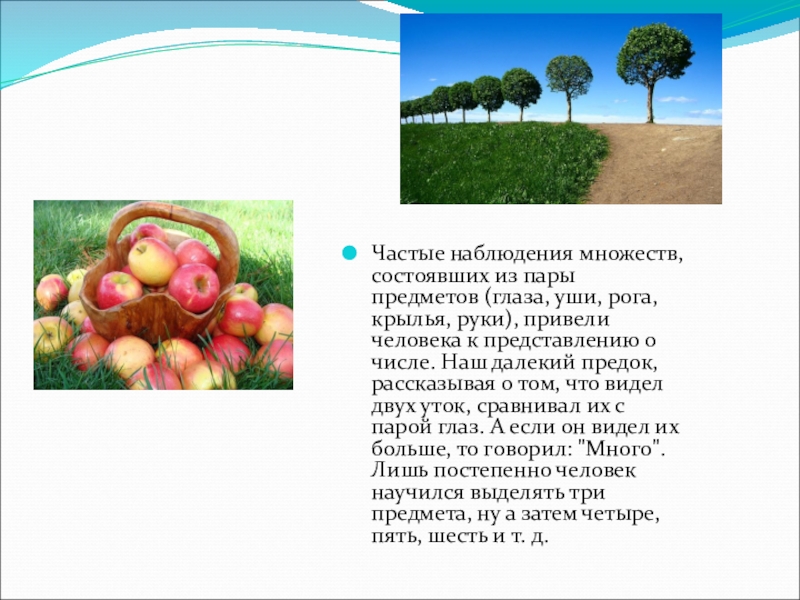 руки), привели человека к представлению о числе. Наш далекий предок, рассказывая о том, что видел двух уток, сравнивал их с парой глаз. А если он видел их больше, то говорил: "Много". Лишь постепенно человек научился выделять три предмета, ну а затем четыре, пять, шесть и т. д.