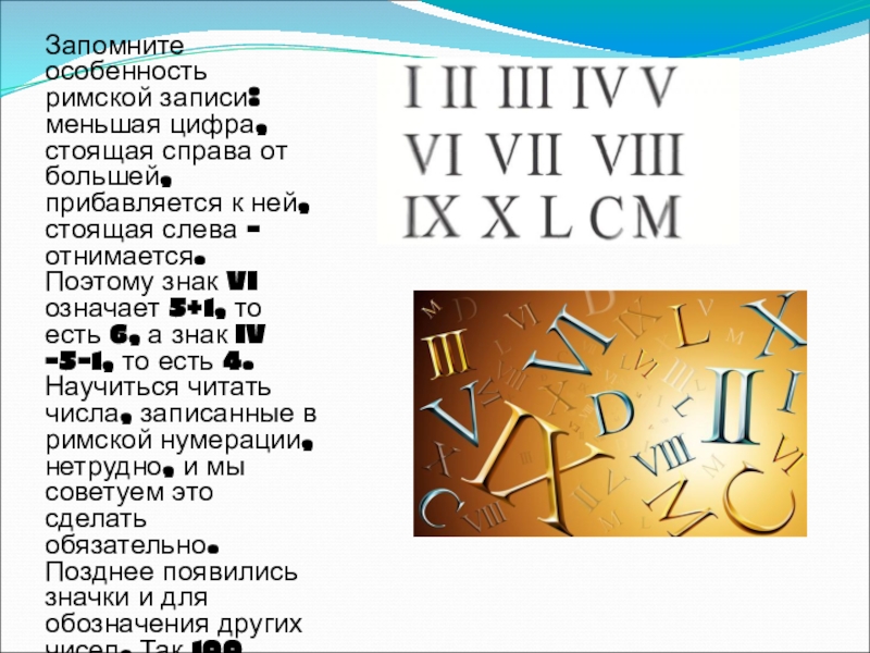 Слайд 25Запомните особенность римской записи: меньшая цифра, стоящая справа от большей, прибавляется