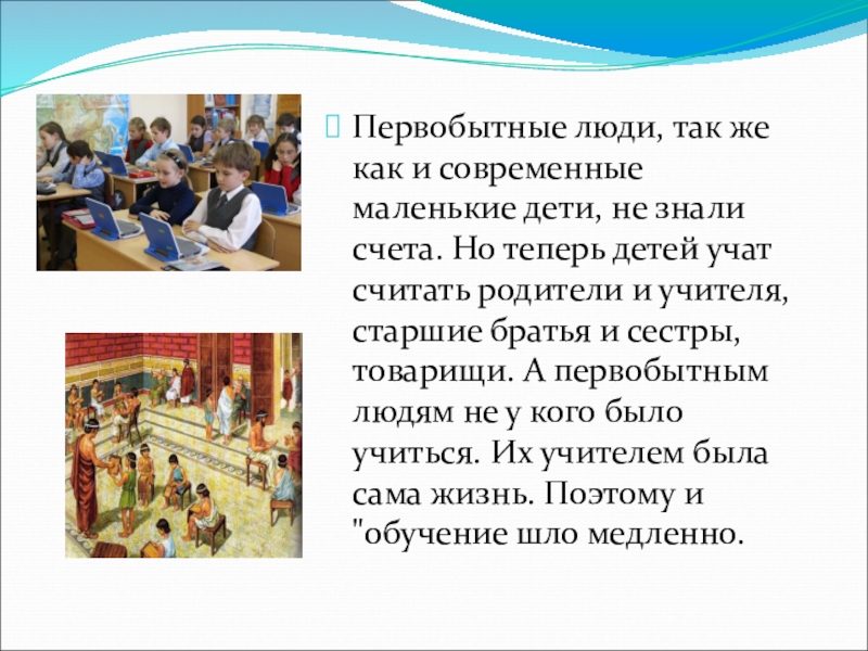 счета. Но теперь детей учат считать родители и учителя, старшие братья и сестры, товарищи. А первобытным людям не у кого было учиться. Их учителем была сама жизнь. Поэтому и "обучение шло медленно.