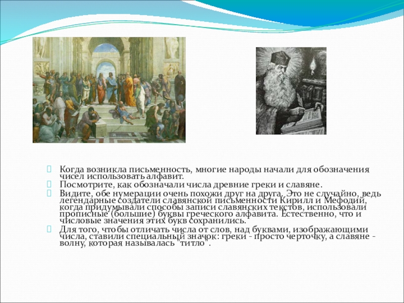Для того, чтобы отличать числа от слов, над буквами, изображающими числа, ставили специальный значок: греки - просто черточку, а славяне - волну, которая называлась "титло".