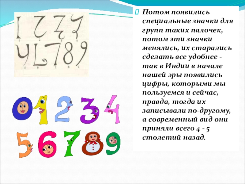 менялись, их старались сделать все удобнее - так в Индии в начале нашей эры появились цифры, которыми мы пользуемся и сейчас, правда, тогда их записывали по-другому, а современный вид они приняли всего 4 - 5 столетий назад.