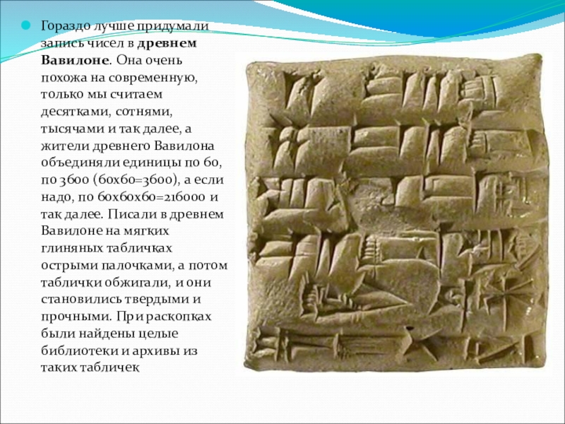 современную, только мы считаем десятками, сотнями, тысячами и так далее, а жители древнего Вавилона объединяли единицы по 60, по 3600 (60x60=3600), а если надо, по 60x60x60=216000 и так далее. Писали в древнем Вавилоне на мягких глиняных табличках острыми палочками, а потом таблички обжигали, и они становились твердыми и прочными. При раскопках были найдены целые библиотеки и архивы из таких табличек
