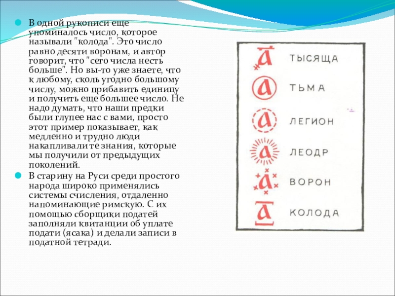Слайд 29В одной рукописи еще упоминалось число, которое называли "колода". Это число