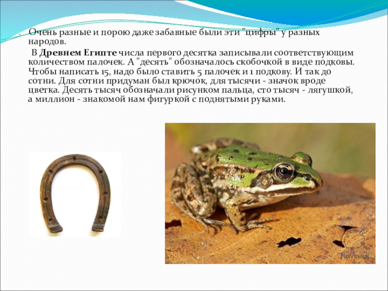 В Древнем Египте числа первого десятка записывали соответствующим количеством палочек. А "десять" обозначалось скобочкой в виде подковы. Чтобы написать 15, надо было ставить 5 палочек и 1 подкову. И так до сотни. Для сотни придуман был крючок, для тысячи - значок вроде цветка. Десять тысяч обозначали рисунком пальца, сто тысяч - лягушкой, а миллион - знакомой нам фигуркой с поднятыми руками.