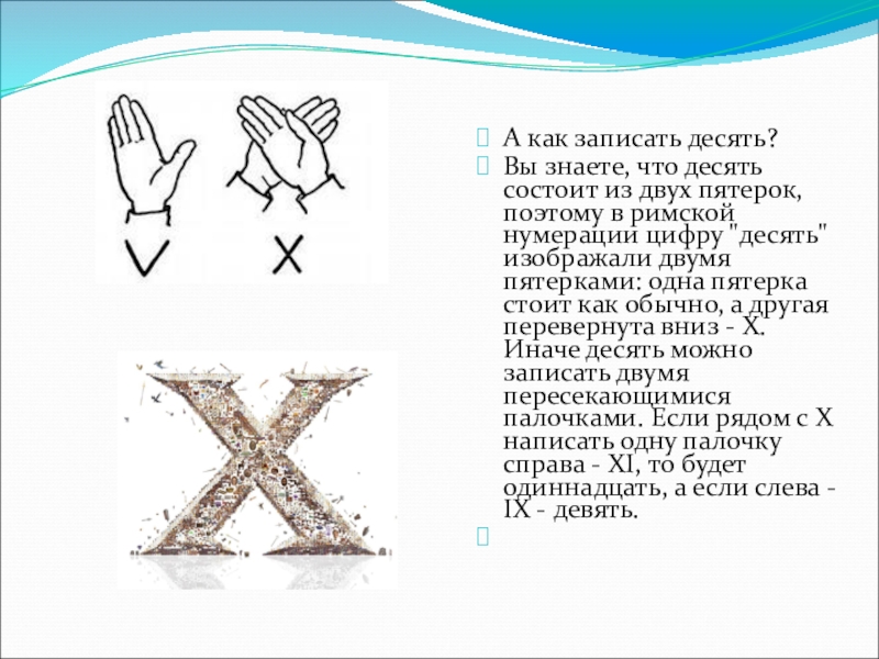 поэтому в римской нумерации цифру "десять" изображали двумя пятерками: одна пятерка стоит как обычно, а другая перевернута вниз - X. Иначе десять можно записать двумя пересекающимися палочками. Если рядом с X написать одну палочку справа - XI, то будет одиннадцать, а если слева - IX - девять.