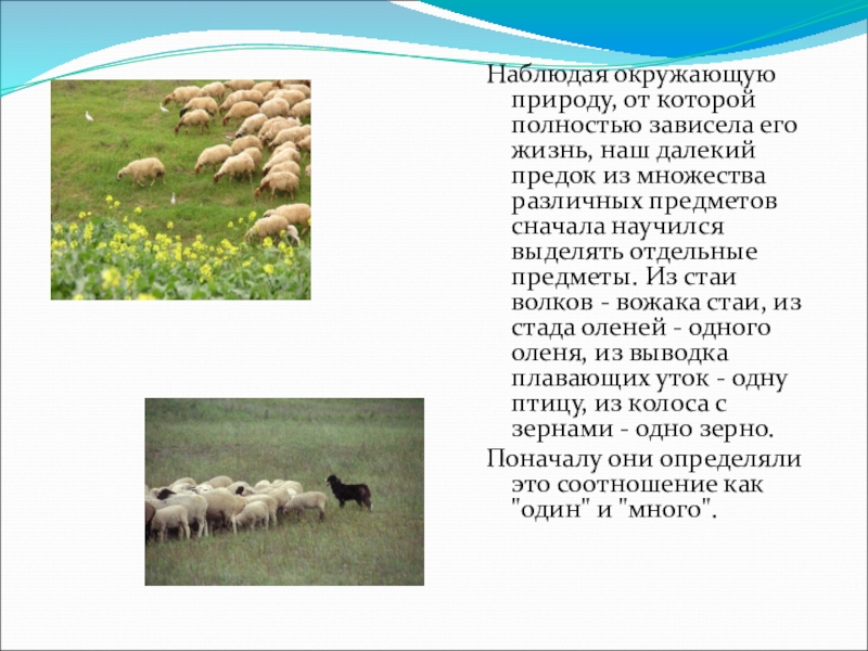 предок из множества различных предметов сначала научился выделять отдельные предметы. Из стаи волков - вожака стаи, из стада оленей - одного оленя, из выводка плавающих уток - одну птицу, из колоса с зернами - одно зерно.