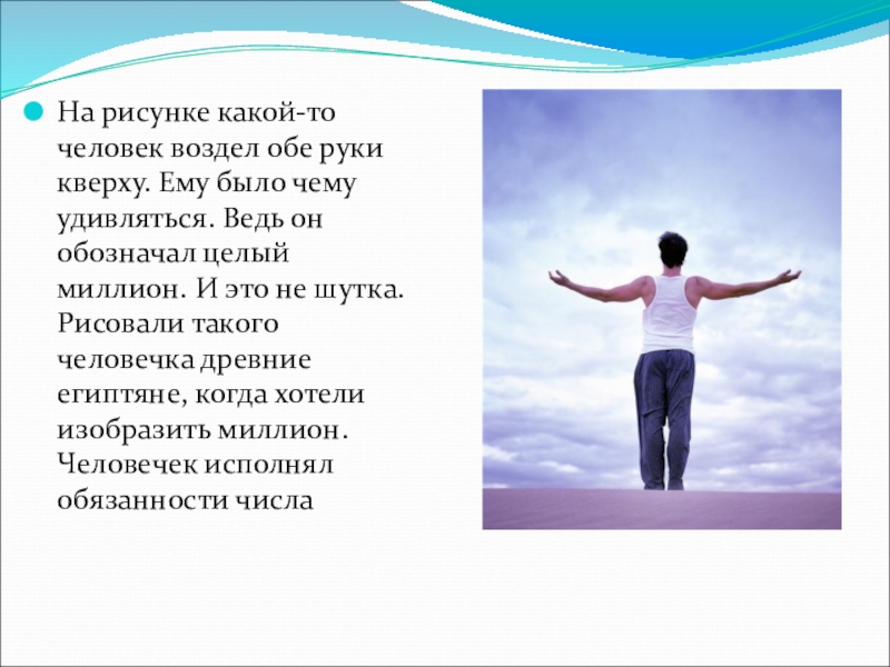 удивляться. Ведь он обозначал целый миллион. И это не шутка. Рисовали такого человечка древние египтяне, когда хотели изобразить миллион. Человечек исполнял обязанности числа