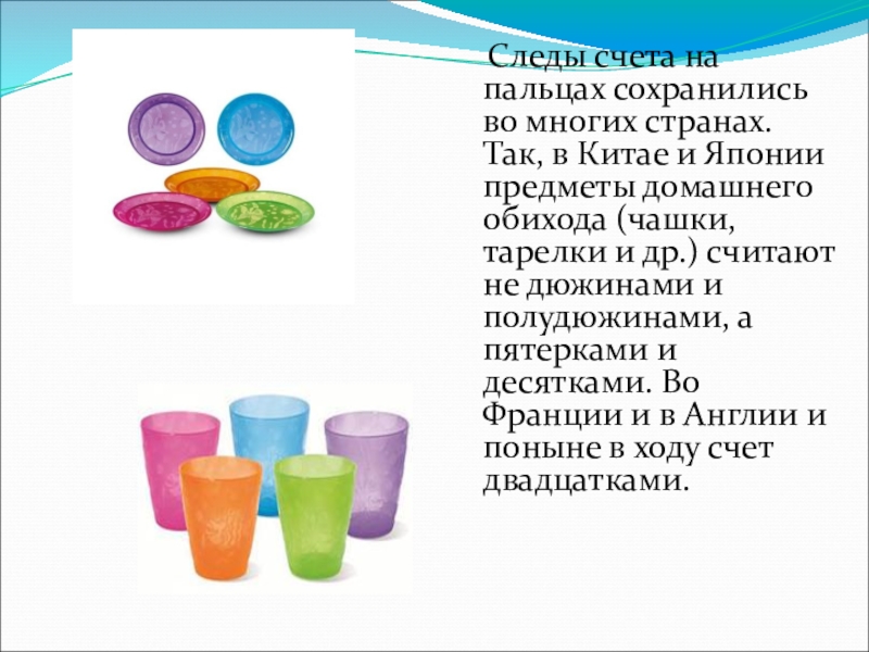 Так, в Китае и Японии предметы домашнего обихода (чашки, тарелки и др.) считают не дюжинами и полудюжинами, а пятерками и десятками. Во Франции и в Англии и поныне в ходу счет двадцатками.