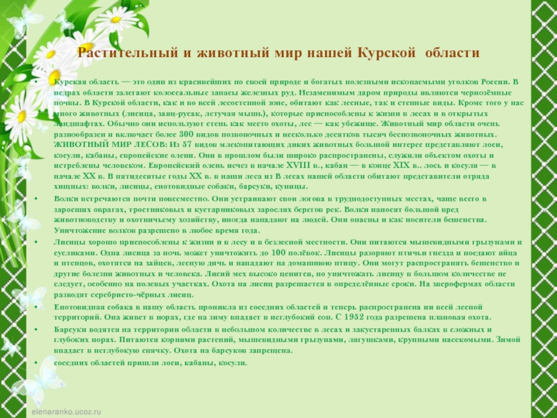 из красивейших по своей природе и богатых полезными ископаемыми уголков России. В недрах области залегают колоссальные запасы железных руд. Незаменимым даром природы являются чернозёмные почвы. В Курской области, как и во всей лесостепной зоне, обитают как лесные, так и степные виды. Кроме того у нас много животных (лисица, заяц-русак, летучая мышь), которые приспособлены к жизни в лесах и в открытых ландшафтах. Обычно они используют степь как место охоты, лес — как убежище. Животный мир области очень разнообразен и включает более 300 видов позвоночных и несколько десятков тысяч беспозвоночных животных. ЖИВОТНЫЙ МИР ЛЕСОВ: Из 57 видов млекопитающих диких животных большой интерес представляют лоси, косули, кабаны, европейские олени. Они в прошлом были широко распространены, служили объектом охоты и истреблены человеком. Европейский олень исчез в начале XVIII в., кабан — в конце XIX в.. лось и косуля — в начале XX в. В пятидесятые годы XX в. в наши леса из В лесах нашей области обитают представители отряда хищных: волки, лисицы, енотовидные собаки, барсуки, куницы.