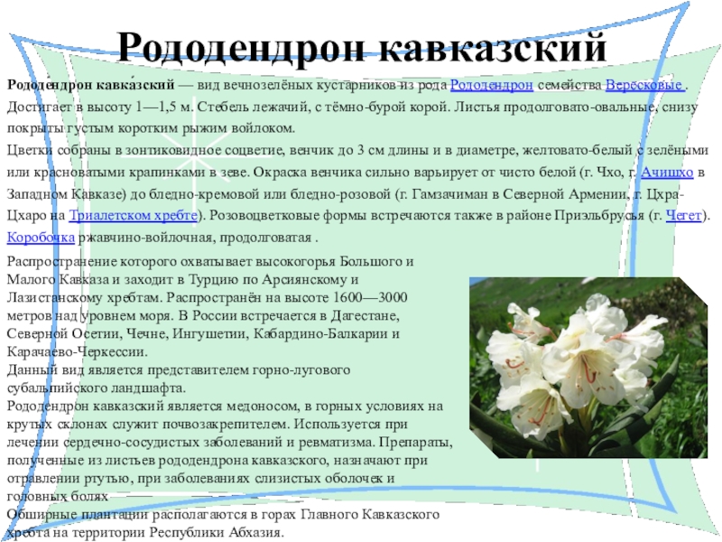 Рододендрон кавказский является медоносом, в горных условиях на крутых склонах служит почвозакрепителем. Используется при лечении сердечно-сосудистых заболеваний и ревматизма. Препараты, полученные из листьев рододендрона кавказского, назначают при отравлении ртутью, при заболеваниях слизистых оболочек и головных болях