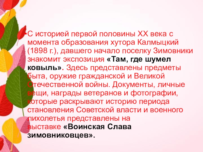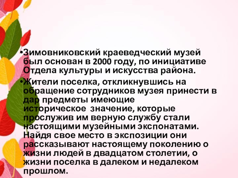 Слайд 3Зимовниковский краеведческий музей был основан в 2000 году, по инициативе Отдела