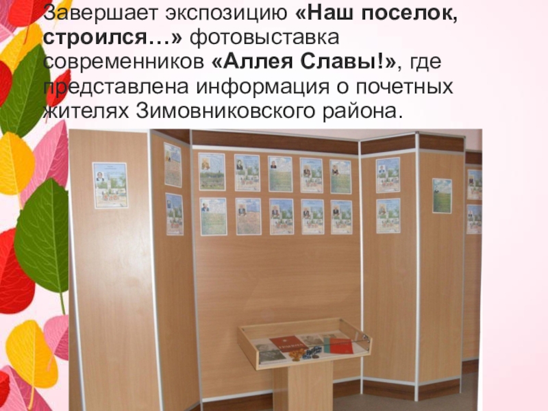 Слайд 27Завершает экспозицию «Наш поселок, строился…» фотовыставка современников «Аллея Славы!», где представлена информация о почетных