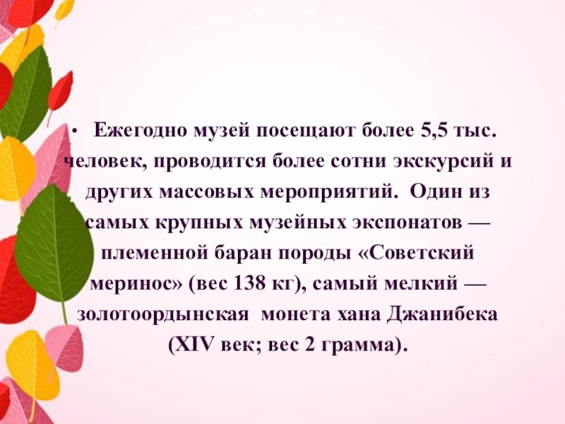 экскурсий и других массовых мероприятий. Один из самых крупных музейных экспонатов — племенной баран породы «Советский меринос» (вес 138 кг), самый мелкий — золотоордынская монета хана Джанибека (XIV век; вес 2 грамма).