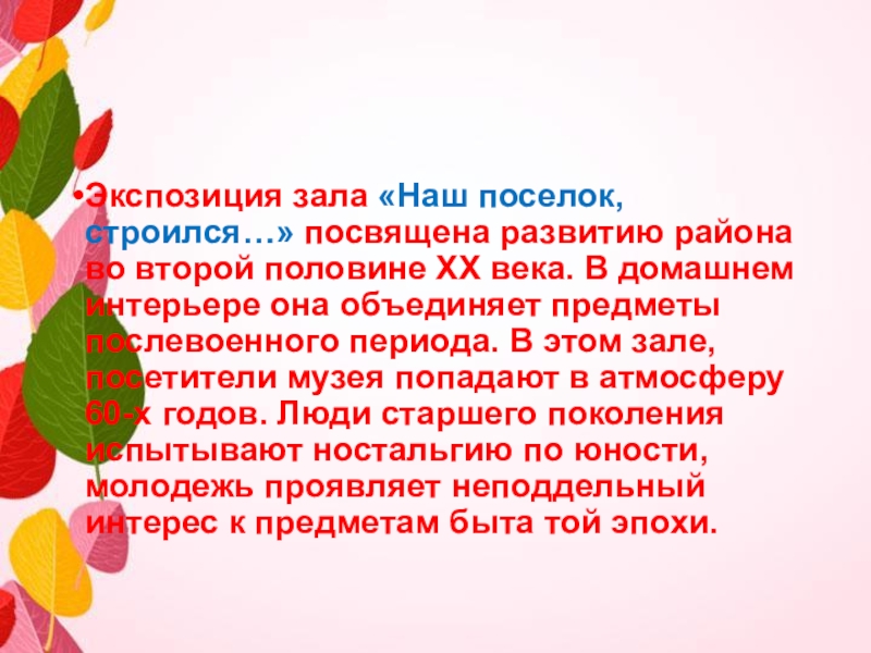 Слайд 25Экспозиция зала «Наш поселок, строился…» посвящена развитию района во второй половине ХХ века.