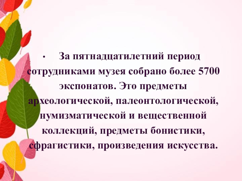 Слайд 4 За пятнадцатилетний период сотрудниками музея собрано более 5700 экспонатов. Это