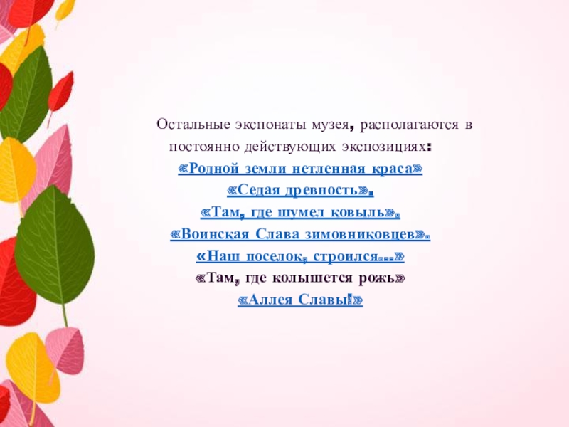 Слайд 15 Остальные экспонаты музея, располагаются в постоянно действующих экспозициях:
