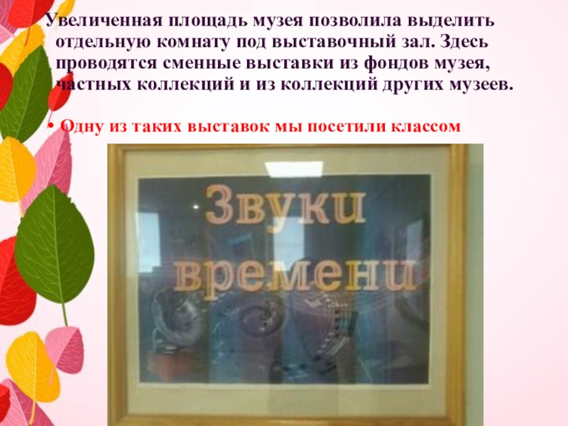 Слайд 5Увеличенная площадь музея позволила выделить отдельную комнату под выставочный зал. Здесь