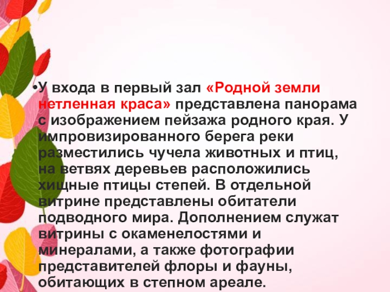 Слайд 16У входа в первый зал «Родной земли нетленная краса» представлена панорама с изображением