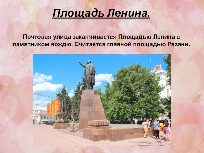 Слайд 7Площадь Ленина. Почтовая улица заканчивается Площадью Ленина с памятником вождю. Считается главной