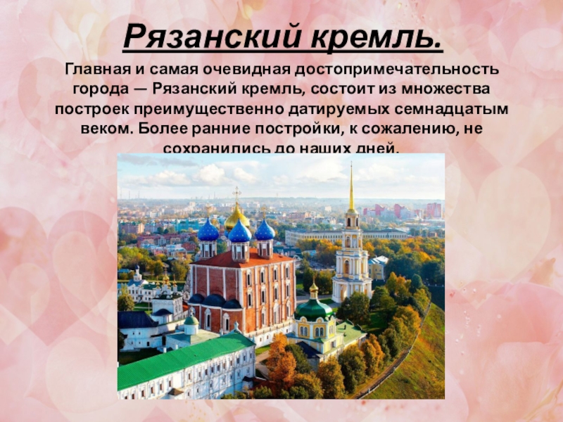 Рязанский кремль.Главная и самая очевидная достопримечательность города — Рязанский кремль, состоит из множества построек преимущественно датируемых семнадцатым веком. Более ранние постройки, к сожалению, не сохранились до наших дней.
