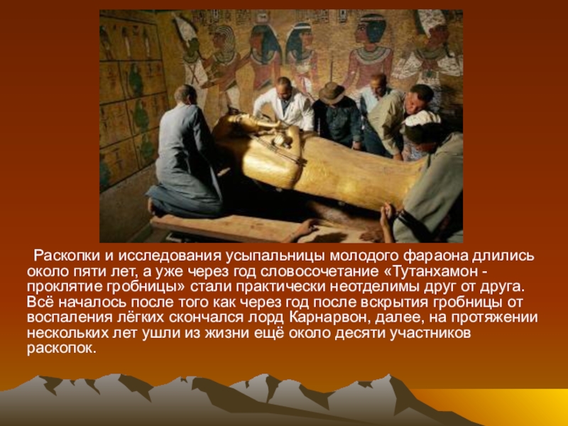 Раскопки и исследования усыпальницы молодого фараона длились около пяти лет, а уже через год словосочетание «Тутанхамон -проклятие