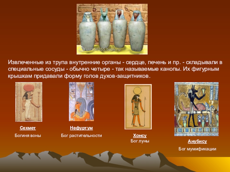 СехметБогиня воныНефуртумБог растительностиХонсуБог луныАнубисуБог мумификацииИзвлеченные из трупа внутренние органы - сердце, печень и пр. - складывали в