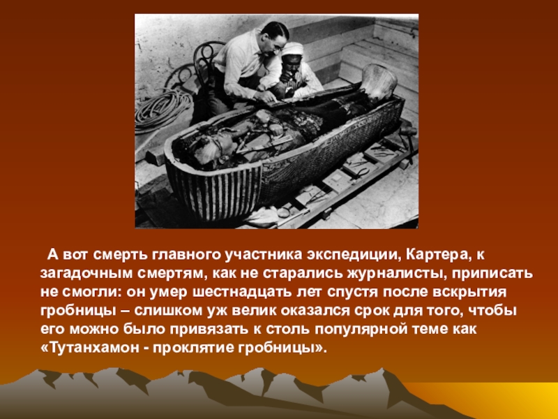 Слайд 7 А вот смерть главного участника экспедиции, Картера, к загадочным смертям, как