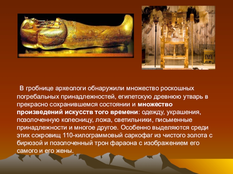 в прекрасно сохранившемся состоянии и множество произведений искусств того времени: одежду, украшения, позолоченную колесницу, ложа, светильники, письменные принадлежности и многое другое. Особенно выделяются среди этих сокровищ 110-килограммовый саркофаг из чистого золота с бирюзой и позолоченный трон фараона с изображением его самого и его жены.