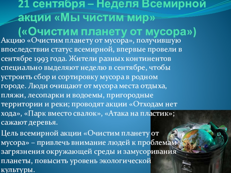 21 сентября – Неделя Всемирной акции «Мы чистим мир» («Очистим планету от мусора») Акцию «Очистим планету от мусора», получившую