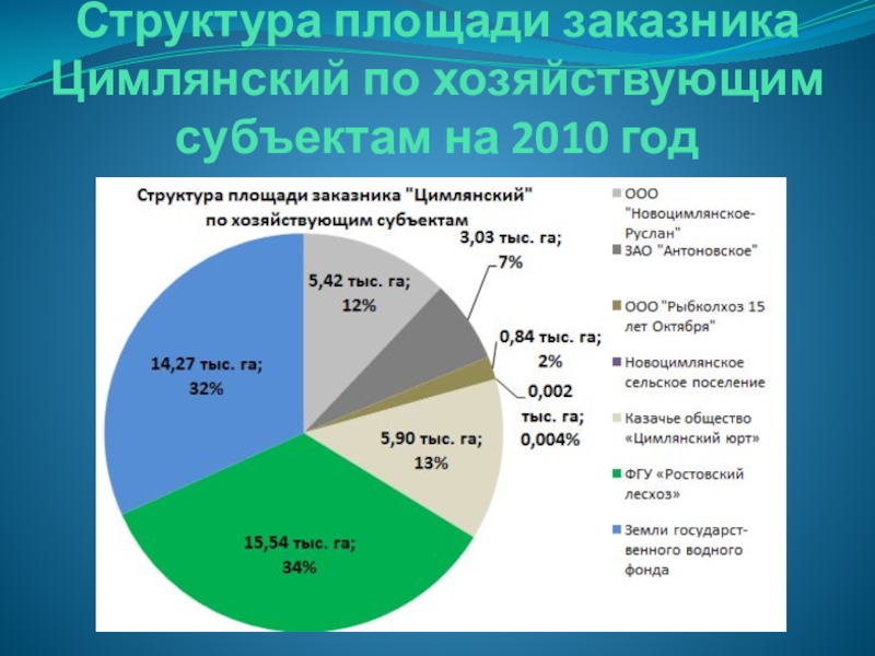 Слайд 7Структура площади заказника Цимлянский по хозяйствующим субъектам на 2010 год