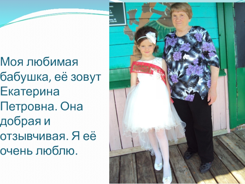 Слайд 5Моя любимая бабушка, её зовут Екатерина Петровна. Она добрая и отзывчивая.