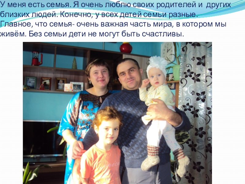 У меня есть семья. Я очень люблю своих родителей и других близких людей. Конечно, у всех детей семьи разные. Главное, что семья- очень важная часть мира, в котором мы живём. Без семьи дети не могут быть