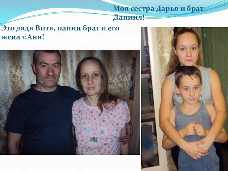 Это дядя Витя, папин брат и его жена т.Аня!Моя сестра Дарья и брат Даниил!