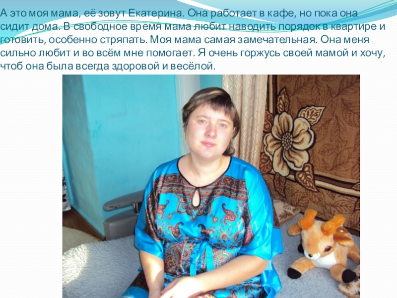 А это моя мама, её зовут Екатерина. Она работает в кафе, но пока она сидит дома. В