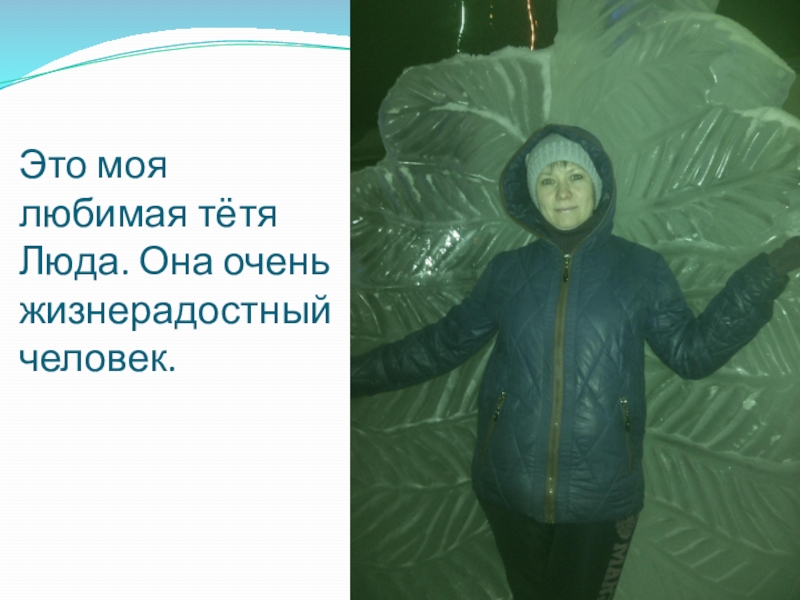 Слайд 13Это моя любимая тётя Люда. Она очень жизнерадостный человек.