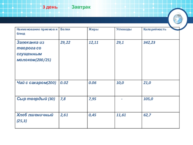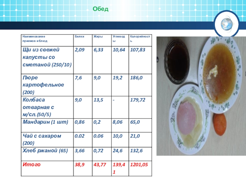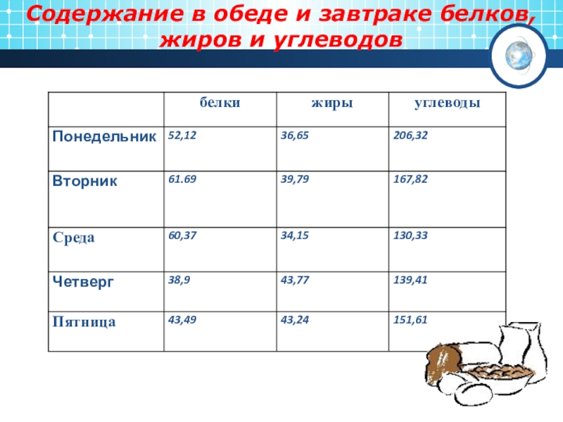 Слайд 26Содержание в обеде и завтраке белков, жиров и углеводов