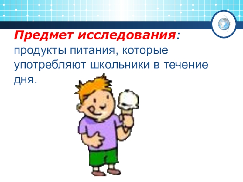 Слайд 6Предмет исследования: продукты питания, которые употребляют школьники в течение дня.