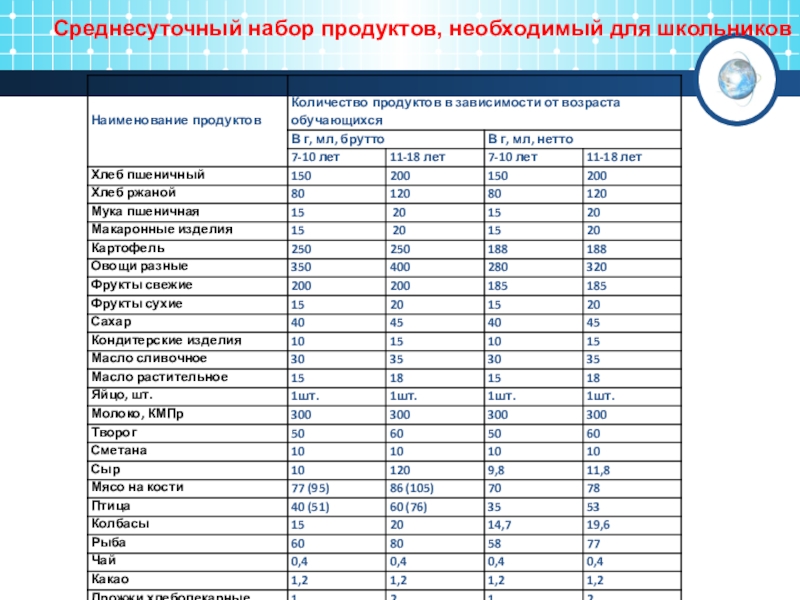 Слайд 14Cреднесуточный набор продуктов, необходимый для школьников