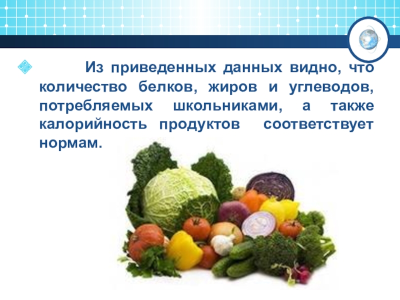 и углеводов, потребляемых школьниками, а также калорийность продуктов соответствует нормам.