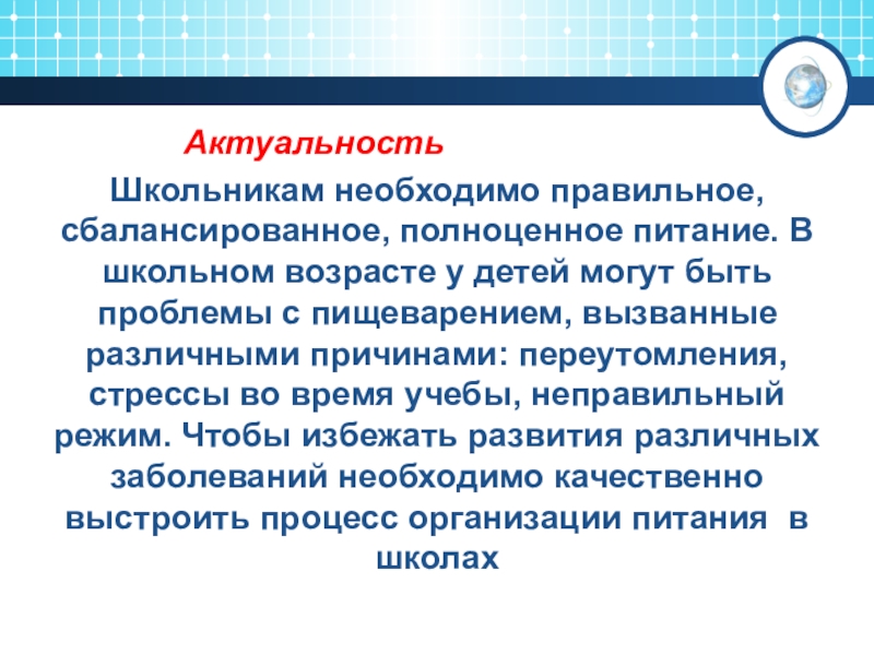 Школьникам необходимо правильное, сбалансированное, полноценное питание. В школьном возрасте