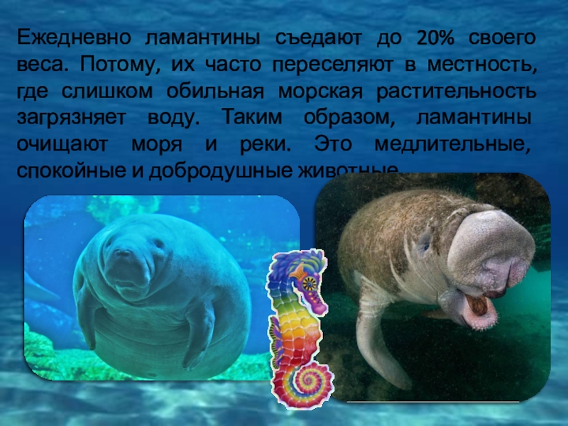 Слайд 9Ежедневно ламантины съедают до 20% своего веса. Потому, их часто переселяют