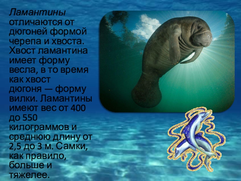 Слайд 7Ламантины отличаются от дюгоней формой черепа и хвоста. Хвост ламантина имеет форму весла,