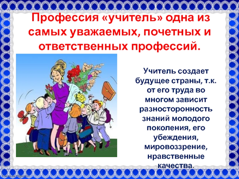 Слайд 7 Профессия «учитель» одна из самых уважаемых, почетных и ответственных профессий.
