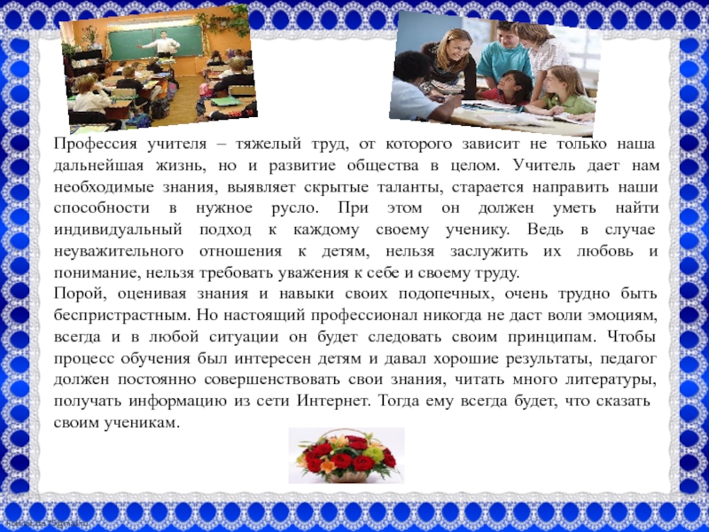Слайд 11Профессия учителя – тяжелый труд, от которого зависит не только наша
