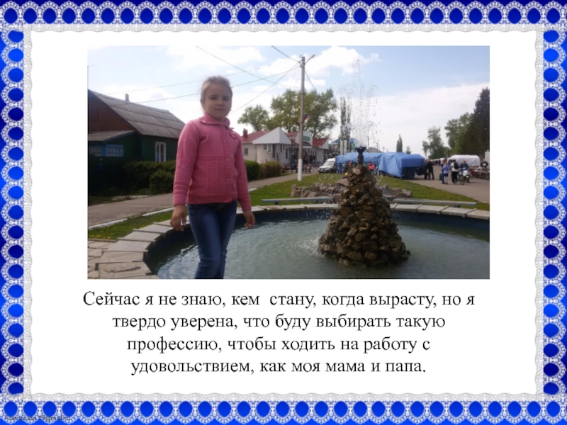 уверена, что буду выбирать такую профессию, чтобы ходить на работу с удовольствием, как моя мама и папа.