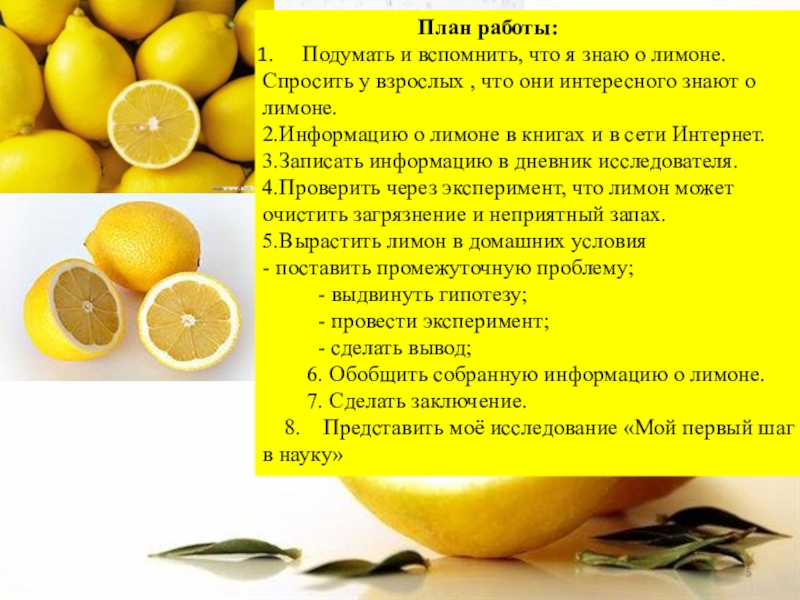 Цель исследования: узнать всё о лимоне. Объект исследования: лимон. Предмет исследования: особенные свойства лимона.