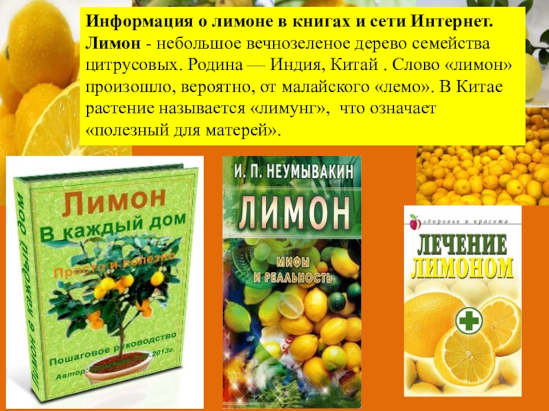 Слайд 7Информация о лимоне в книгах и сети Интернет.